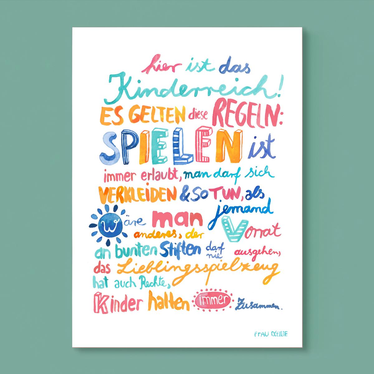 "Hier ist das Kinderreich. Es gelten diese regeln: Spielen ist immer erlaubt, man darf sich verkleiden und so tun als wäre man jemand anderes. Der Vorrat an bunten Stiften darf nie ausgehen. Das Lieblingsspielzeug hat auch Rechte. Kinder halten immer zusammen."