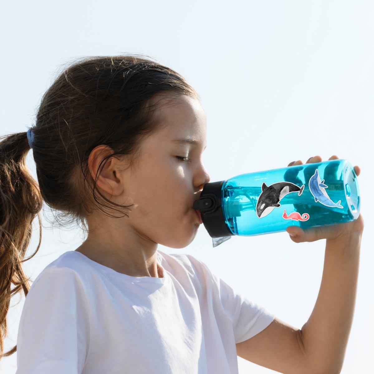 Unsere wasser- und spülmaschinenfesten Aufkleber *Wildes Meer* für Mädchen und Jungen wurden für alle Unterwasser Fans illustriert. Wal, Delphin, Hai, Oktopus, Schildkröte, Robbe oder Clownfisch - diese bunte Schar umfasst die beliebtesten Meerestiere.